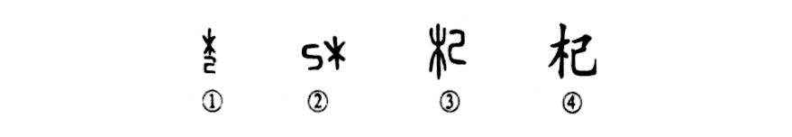 這是“杞國無事憂天傾”的“杞”字,讀作qǐ,是個形聲字。甲骨文①的上部是“木”,下部是“己”。②是金文的形體,左“己”右“木”。③是小篆的形體,其結構位置與金文正相反。④是楷書的寫法。