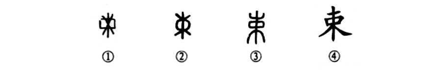 “束”字是個會意字。甲骨文①的外部的方圈是繩索之類,其中間有三根木柴,也就是用繩索捆綁木柴的意思。金文②是把方圈變為圓圈,也是捆綁木柴之意。小篆③是繩圈在內,而“木”在外,不過變成了一條“木”了。楷書④是在“木”字的中間加一個扁“口”,也仍然是束木之意。