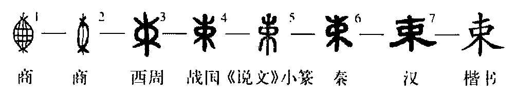 (字形2),像兩頭用繩索扎住的橐(橐無底,所以盛物時要扎住兩頭),是“束”字的初文,也是“橐”字的初文(參見橐部“橐”字條);又曾借為“東”本義是系,捆。