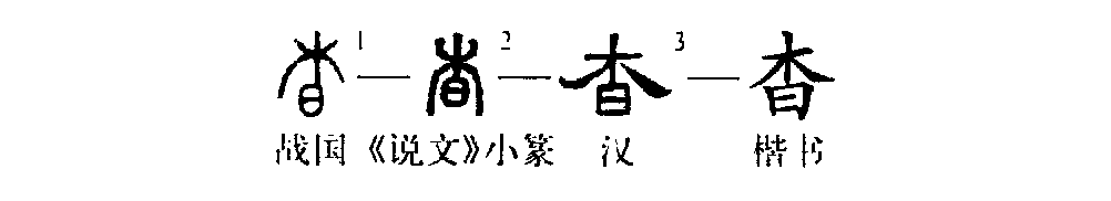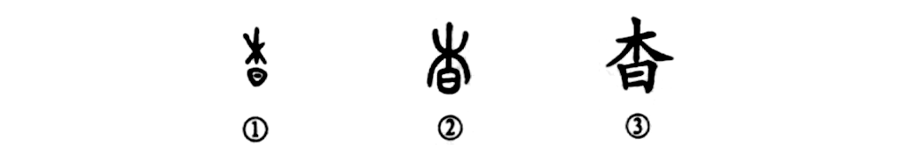 這就是“杳無(wú)音訊”的“杳(yǎo)字。一看形體,就知道字義的大概。你看甲骨文①的上部是樹(shù)木,根部是“日”(太陽(yáng)),表示太陽(yáng)已經(jīng)落下去了,這就是“幽暗”的意思。所以“杳”字是個(gè)會(huì)意字。小篆②的形體與甲骨文相仿佛,上“木”下“日”。楷書(shū)③也相似。