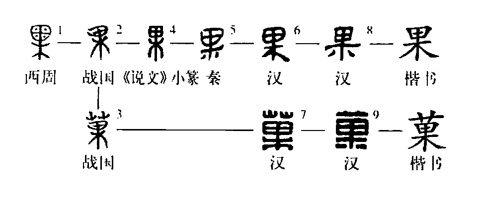 ”由于“果”多用于引申義,遂加“艸”旁分化出“菓”字來表示本義。