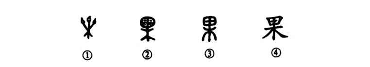 ?這是“碩果累累”的“果”字。這是個象形字。甲骨文①的下部是“樹”(木),樹梢上結(jié)滿了果實。②是金文的形體,是在“木”上長了一個又圓又大的果實。③是小篆的形體。④是楷書的寫法,都是由金文演變而來的。