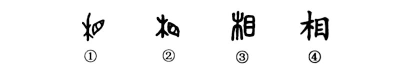 這是個“相”字。甲骨文①的左邊是“木”(樹),右邊是“目”(眼睛),用“目”看樹木就是“相”的本義。所以“相”字是個會意字。②是金文的形體,與甲骨文的形體基本相同,只是筆畫變粗了一些。小篆③與甲骨文的形體相類似。④是楷書的寫法。