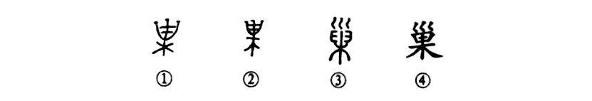 “覆巢之下,焉有完卵?”這個“巢”字讀作cháo,本為象形字。①是甲骨文的形體,其下為樹木之形,上部為鳥巢形。②為金文的形體,與甲骨文形體相似。③是小篆的形體,其上部像巢上有三只鳥的樣子。④為楷書的寫法。