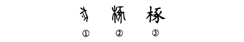 這個(gè)“椓”讀作zhuó,本為象形字。甲骨文①是一頭腹朝左、背朝右、頭朝上、尾朝下的豕(豬),腹部的小點(diǎn)是表示公豬的生殖器已被割下。②是小篆的形體,即在“豖”的左邊加“木”,表示以木將生殖器枷掉。由原來的象形字變?yōu)闀饧嫘温暤淖?。③是楷書的寫法?/span>