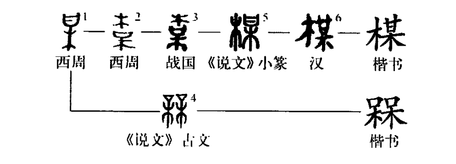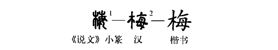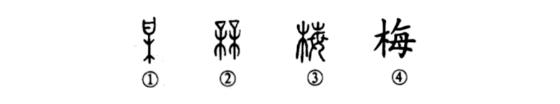 ”正是指“梅子”。)③是小篆的形體,變成“從木每聲”的形聲字了。④為楷書的寫法。