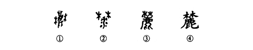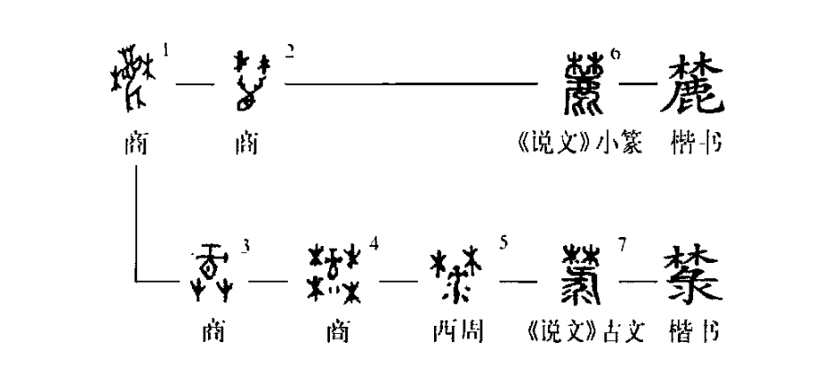 形聲字。商代甲骨文或從林、鹿聲(字形1。字形2省去了像鹿身的部分),或從林、錄聲(字形3。參見錄部“錄”字條。字形4從四木,與從“林”同意)。前者演變為《說文》小篆,后者演變為西周金文和《說文》古文。古書中通用“麓”字。本義指生長在山腳的林木。