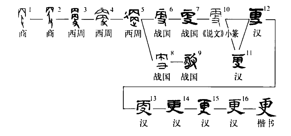 ,或易攴為辵(換為辵不影響所表更改意)。戰國時從攴丙聲為主流結構,從又丙聲的也不少,有的增加了構件口。隸變使其形聲結構被破壞,變成一個記號字更。本義是更改。
