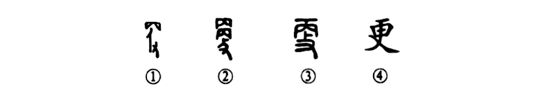 “一夜連雙歲,五更分二年。”這個“更”字本為形聲字。①是甲骨文的形體。上部是“丙”,表聲;下部是“攴”,表形,即像手握馬鞭的形狀。于省吾先生認為:“更即古文鞭字。”②是金文的形體,上部又增加了一個“丙”字,其義未變。③是小篆的形體。④為楷書的寫法。