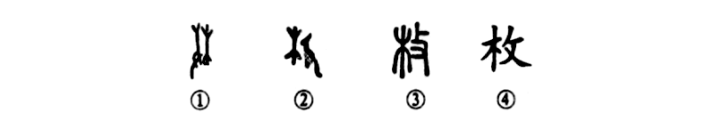 “風入園林寒漠漠,日移宮殿影枚枚。”這個“枚”字本為會意字。①是甲骨文的形體,左邊像手執工具撲打右邊的樹木。②是金文的形體,左邊為樹木之形,右邊是手執一把大砍刀向樹干砍去。③是小篆的形體,其右邊變為“攴”,意義沒有變。④是楷書的寫法。