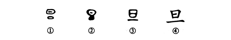 ”可見“旦”與“暮”是相對的,“旦”是早晨,“暮”是晚上。甲骨文①的上部是“日”,下面的部分表示地面或水面。金文②是海上看日出的樣子,火紅的太陽剛跳出海面,其下部水日相連,好像還有半個太陽在水中。③是小篆的形體,“日”下部分變成了一條線。④為楷書形體。
