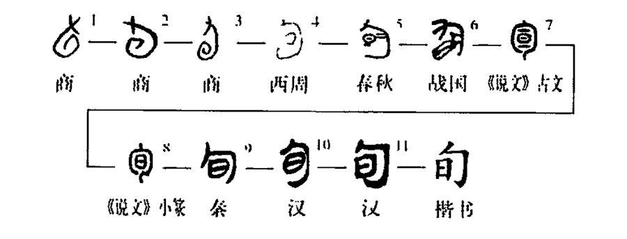 (勹或旬)。到了西周加“日”旁作為形符,則勹為聲符。春秋戰國文字以勻為聲符。《說文》旬之古文??之形即春秋戰國文字