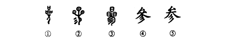 這是“人生不相見(jiàn),動(dòng)如參與商。”的“參”字,本為象形字。①是甲骨文的形體,下部為人形,人上有三顆星,表示參星高照。②是金文的形體。星的左下方有“彡”,表示星的光芒。朱芳圃說(shuō):“參象參宿三星在人頭上,光芒下射之形。”③為小篆的形體,與金文相似。④為楷書繁體字。⑤為簡(jiǎn)化字。
