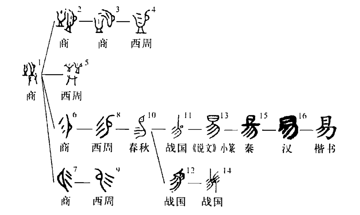 會意字。像雙手持器(有鋬)向另一器(無鋬)傾注液體之形。該字構(gòu)形的發(fā)展可以分為繁簡二系。繁系包括1-5各形,其通行時間為商代到西周,其中2(省去雙手形)、3(省去雙手形及有鋬器之圈足形)、4(省去雙手形及無鋬器形)各形是1逐步簡化的結(jié)果,而5則是1的直接繼承,只是雙手的位置放在兩器的正下方,與初文放在有柄之器下者有所不同。簡系包括6-12各形,其存在時間為商代至今。其中6或7形應(yīng)看成由4形所代表的有柄之器經(jīng)過截除性簡化而形成的,即截取器形中靠近鋬的部分和器中的液體,而省去其他部分。12則是簡系中為追求美觀而有意繁化的結(jié)果。易字本義當為傾注(此義不見于文獻,而表示注水器的匜字可能是其同源詞),引申為賜予,后代一般用賜(賜)記錄這個意義。旅鼎:“公易(賜)旅貝十朋。”臣卿鼎:“臣卿易(賜)金。”《商君書·錯法》:“夫離朱見秋豪百步之外,而不能以明目易人;烏獲舉千鈞之重,而不能以多力易人。”又引申為更易。甲骨文常見“易日”一語。《易·系辭下》:“上古穴居而野處,后世圣人易之以宮室。”文獻中常見的“難易”之“易”,應(yīng)該看成借字(無本字)。(孟蓬生)