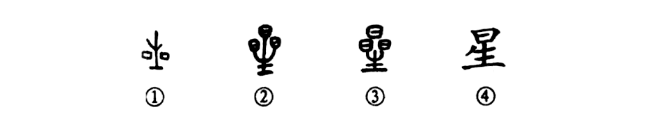 “星星點(diǎn)點(diǎn)撒夜空”的“星星”,也正如甲骨文①左右兩個(gè)小方塊。金文②上部的三個(gè)“日”字,更是夜空繁星的形象。甲骨文中間像小樹(shù)苗的部分和金文除去三個(gè)“日”的部分就是“生”字。③是小篆的形體,與金文的形體相似。到了楷書④則去掉了兩個(gè)“日”,寫為“星”。