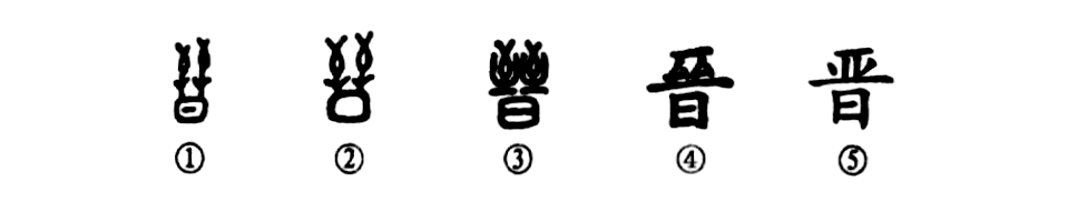 這個“晉”字是個會意字。甲骨文①上為兩矢,下為“日”,實為一器物,好像兩矢插進器中之形。②是金文的形體,下部更像器形。③是小篆的寫法,與甲骨文相似。④是楷書繁體字的寫法。⑤為簡化字。