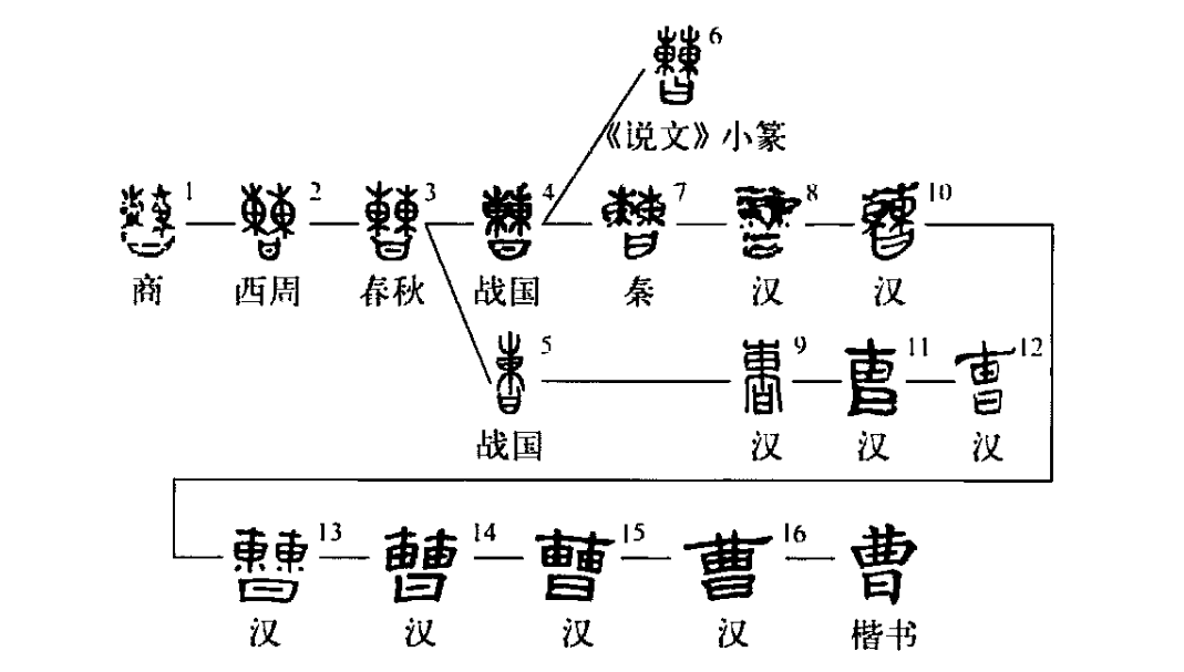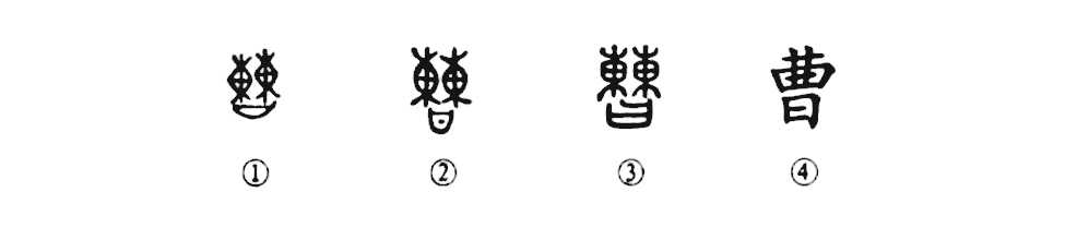 ”,后又連通頂部兩個短橫,最后合并中間兩個短豎,全字成為“曹”形。漢代還有承戰國簡化形式“