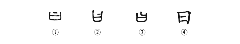 這是子曰詩云的“曰”字。甲骨文①的下部是“口”,上面的一橫表示說話時從口中出來的氣。(也有人說,一橫是代表說話時發出的聲音。)金文②的形體與甲骨文相似。小篆③的形體同于金文。④是楷書的形體。