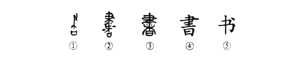 “讀萬(wàn)卷書(shū),行萬(wàn)里路。”這個(gè)“書(shū)”字原為象形字。甲骨文①的上部是“聿(筆)”,也就是手執(zhí)筆的形象。下部的“口”表示書(shū)寫(xiě)之物。②是金文的形體,上部仍為“聿”字,下部變成了“者”字,這就成為“從聿,者聲”的形聲字了。③是小篆的寫(xiě)法,與金文基本相似。④為楷書(shū)繁體字。⑤為草書(shū)楷化的簡(jiǎn)化字。