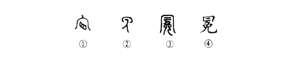 這是“冠冕堂皇”的“冕”字,本為會意字。①是金文的形體,上部是個大帽子的形狀,其內為“目”,代表人頭。這就表示人頭上有帽子。②也是一種金文的形體,其下部是面朝左側立的“人”,上部是一頂大帽子。其實,①②就是“免”字,本來就當“帽子”講。可是到了小篆③,則又在其上增加了一頂大帽子。④是楷書的形體。