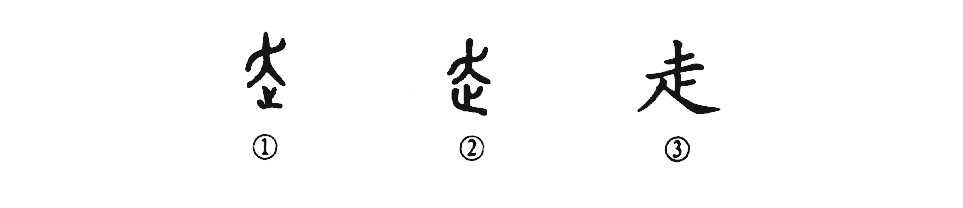 杜甫的《石壕吏》詩(shī):“老翁逾墻走,老婦出門看。”是說(shuō)老翁跳出墻去慢慢地“走”了嗎?完全不是。你看金文①的上部是一個(gè)甩開兩臂的“人”形,下部是一只大腳(止),在跑呢!所以在古代“走”就是“跑”的意思。②是小篆的形體,上部的人形還在,只是下部的“止”不像腳形了。③是楷書的形體。
