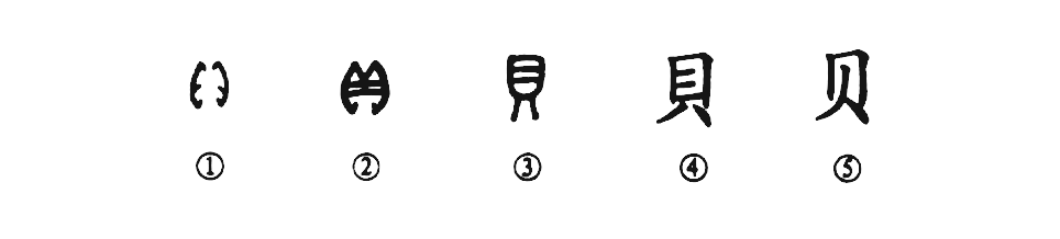 甲骨文①就像左右兩扇貝殼。金文②基本上像甲骨文的形狀,中間連在一起。可是到了小篆③就發生了偽變,根本看不出貝殼的樣子了。④是楷書形體,類似于小篆。⑤是簡化字,從楷書的行草體變來的,僅有四筆,書寫方便。