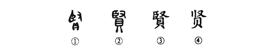這是“賢能云集”的“賢”字,本為形聲字。①是金文的形體。其上部為“臤”,表聲,下部為“貝”,即財物,財物多為“賢”。②是小篆的形體,與金文相似。③是楷書繁體字。④為簡化字。
