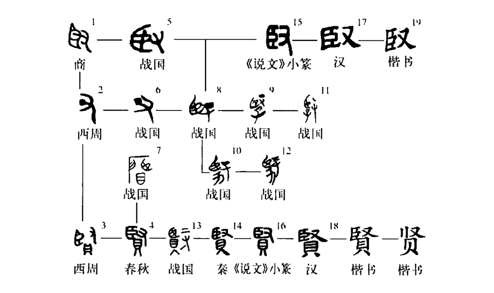 ”“賢”始見于西周金文(字形3),是在假借字上加注意符造出的分化字。國有賢人,猶家之有財,故“賢”字從“貝”。戰(zhàn)國文字或從“賢”省、從“戶”(字形7),寓家有賢人之意;或從“子”(字形9、11),有尊賢之意;或從“力”(字形10、12),取賢者多力之意。在宋元以來的一些小說戲曲刻本中,“臤”旁多簡作“