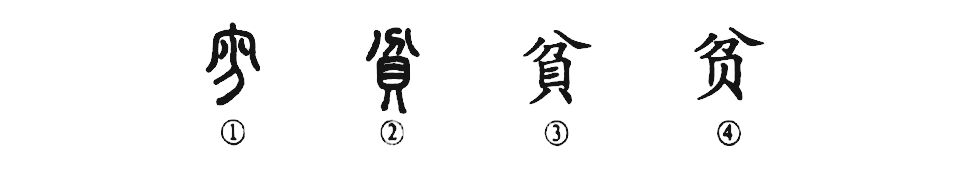 “分”,分什么?什么也沒有,故為“貧”。商承祚先生認為:“去貝則貧,此存分之意而取無貝之實也。”②是小篆的形體,變成形聲字。其上為“分”,表聲,其下為“貝”,表形。③是楷書繁體字。④為簡化字。