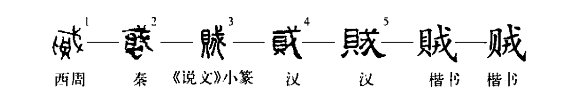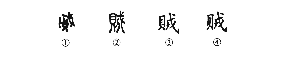 這是“射人先射馬,擒賊先擒王”的“賊”字。金文①的左邊是一只手,右邊是“戈”(武器),中間是“貝”(貴重之物),這就表示“手持戈破貝”之意。