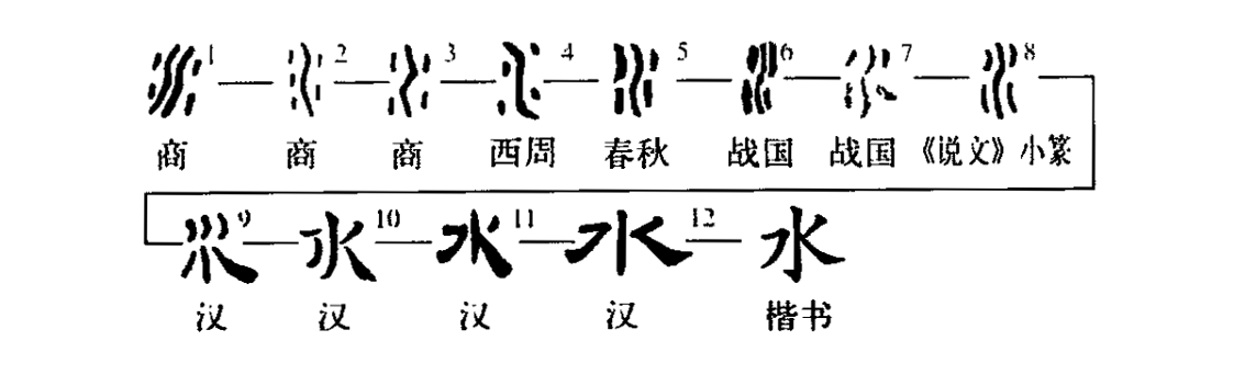 形,仍不失象形之意。至漢,像水流之曲筆逐漸向直筆過渡,像水滴的點畫兩相連屬,終成“水”字,象形遂失。甲骨文水字用作偏旁時,除圖表所列諸形外,或作