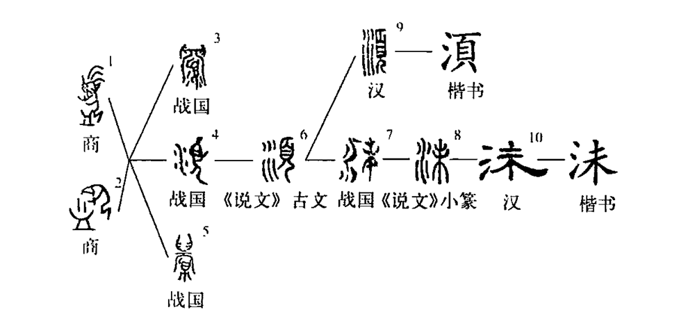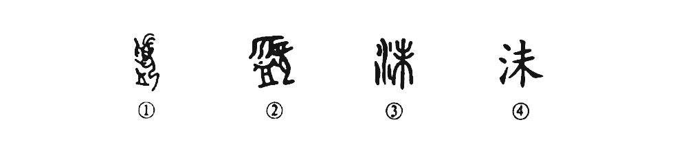 這是個“沬”(huì會)字。從甲骨文①看得很清楚,右邊是面朝左彎著腰的一個人,左下部放著一個器皿,左上方是人的手,即用手捧水在洗臉洗頭。金文②也基本上是甲骨文的形象。可是到了小篆③就簡化成左形(水)右聲(未)的形聲字了。楷書④與小篆的形體基本一致。