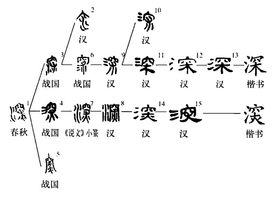 形聲字。從水,罙聲。水名。即今湘水支流的瀟水。其上源至江華瑤族自治縣一段仍稱深水。