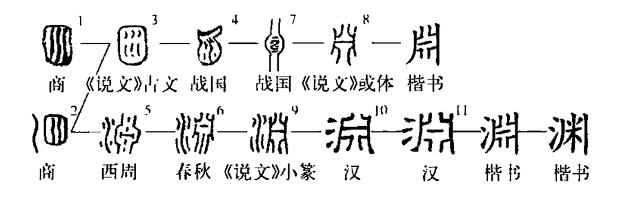 【譯文】淵,回旋的水。從水,()象形。左右的丿丨,表示水岸。中間的,象水的樣子。,淵的或體,由淵省去左邊的水旁。囦,古文淵字,由囗、水會意。