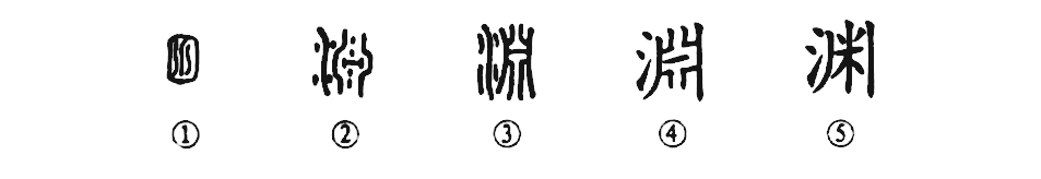 這是“如臨深淵”的“淵”字。甲骨文①的外圍像一個大水潭,其中有三條曲線,表示水形。金文②的右邊像一個水澤,當中有“水”,但其左又加上了水旁,這就多此一舉了。③是小篆的形體,基本與金文相類似。④是楷書的寫法,由小篆演變而來。⑤是簡化字。