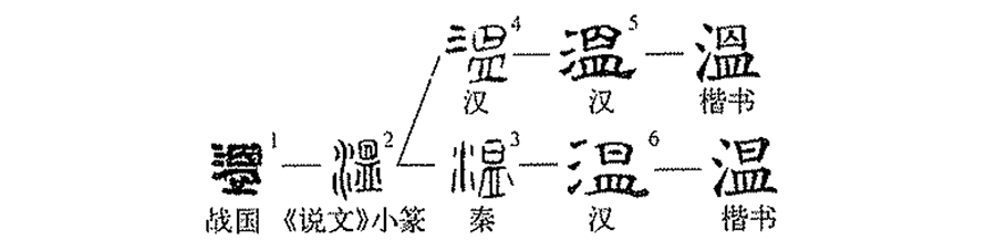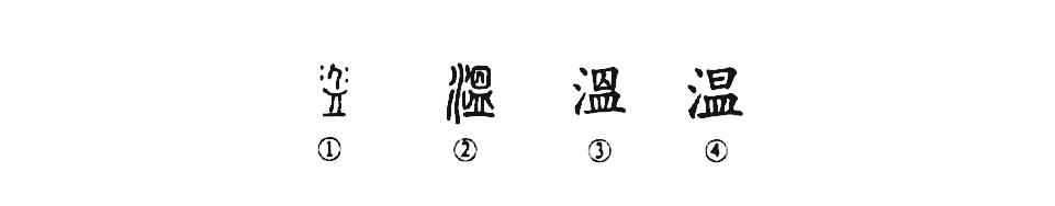 “漸覺一家看冷落,地爐生火自溫存。”這個“溫”字本為會意字。在甲骨文中,“溫”、“浴”很可能就是一個字。甲骨文①“人”旁的四個小點是水氣,像人在容器中洗身的樣子,所以有“溫”義。②是小篆的形體,左邊是“水”,右邊的形狀仍與洗浴有關。③是楷書異體字的寫法。④為楷書通行體,將“囚”改為“曰”,書寫方便。