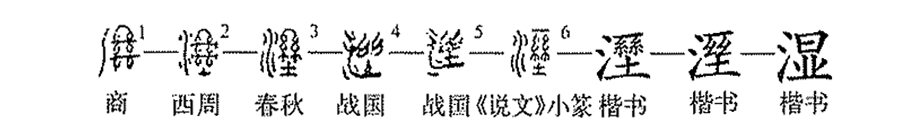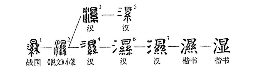 會意兼形聲字。初文從日、從水、從絲(像兩束絲),像日下曬濕絲之形,會干濕之濕意。本義為濕。《玉篇》同“溼”,《說文》作“濕”,后代二字通用無別。今用作干濕之義統作“濕”。讀shī。又音tà。水名。古代黃河下游主要支流之一,在今山東省境內。后作“漯”。