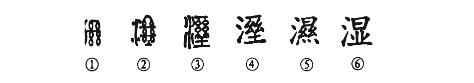 “住近湓江地低濕,黃蘆苦竹繞宅生。”這個“濕”字本為會意字。①是甲骨文的形體。右邊本為絲接續之形,左邊是“水”,意思是:水將絲滲濕。②是金文的形體,在“絲”下增加了一個“土”字,表示土濕。③是小篆的形體。④為楷書的寫法。⑤本為水名,后世則把它借來當“濕”字的繁體字用。⑥為簡化字。