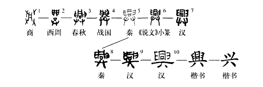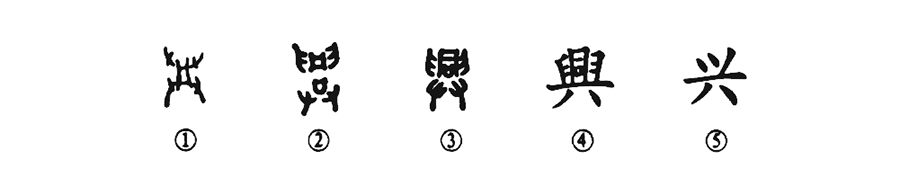 會意字。甲骨文“興”字像四角各有一手,共同抬起一個大盤的形狀。金文盤下加“口”,當是眾手共同用力、口呼號子的意思。“興”現在簡化字為“興”。