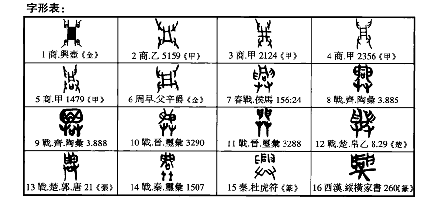 :殷金文、甲骨文從舁、從凡,會四隻手抬起架子的意思。後“凡”下加“口”形,《說文》遂以為從“同”。戰國文字“凡”形、“口”形變化較多。