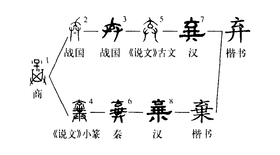 、從子置于“其” (“箕”之本字)上,“其”亦表聲。周以后,“棄”字習從倒子形,所從之其或訛作